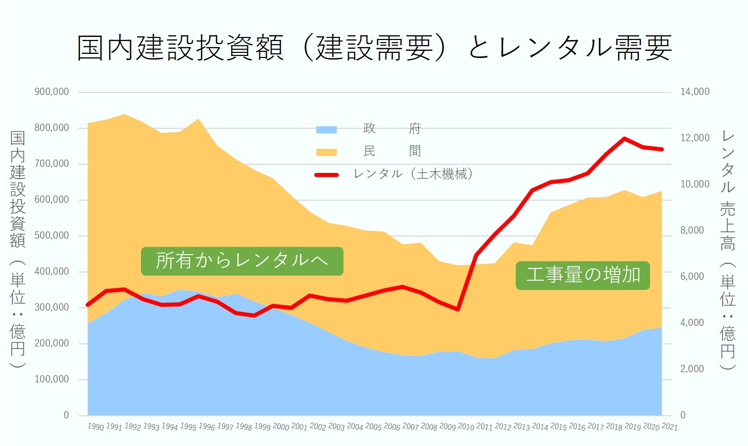 1990年ごろから、2010年ごろまで、景気が減退していく中でも、レンタルの需要はほぼ横ばいで推移していきました。