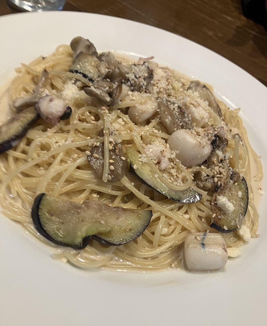 パスタは自分好みに具材やソースをカスタマイズできる画期的なメニューでした!私はイカ・タコ・マイタケ・ナスをクリームソースを注文。シェフのアレンジでわさび醤油の風味をつけた一品に仕上がりました!いいアクセントになり、美味しさが増していました!