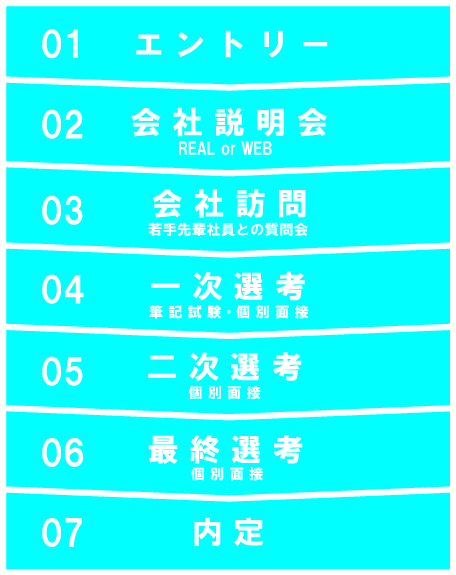| 提出書類 | 履歴書・卒業見込証明書・成績証明書 ※選考に進む際に、ご提出いただきます。 |