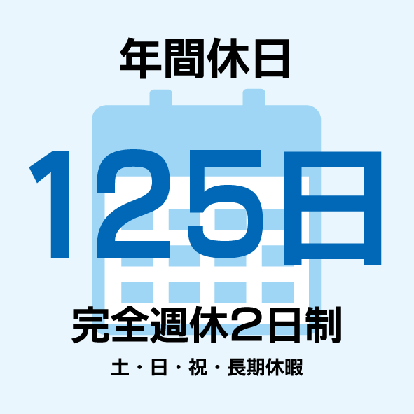 | 休日休暇 | 完全週休2日制(土曜日・日曜日・祝日・長期休暇含む) 年間休日:125日以上 長期休暇:年末年始休暇・夏季休暇 有給休暇:入社半年後10日間 その他:特別休暇(慶弔休暇) |